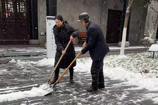 为保障参观通道安全畅通,1月20日清晨,馆内党员干部带头,全体工作人员迅速投入扫雪除冰行动。大家分工协作,有的用铲雪板并排推进清理主干道,有的手持扫帚清扫残留浮雪,还有的用铁锹将积雪集中归拢到不影响通行的角落。寒风里,铁锹与地面的碰撞声、同事间的互助吆喝声交织成一曲冬日奉献的劳动之歌。