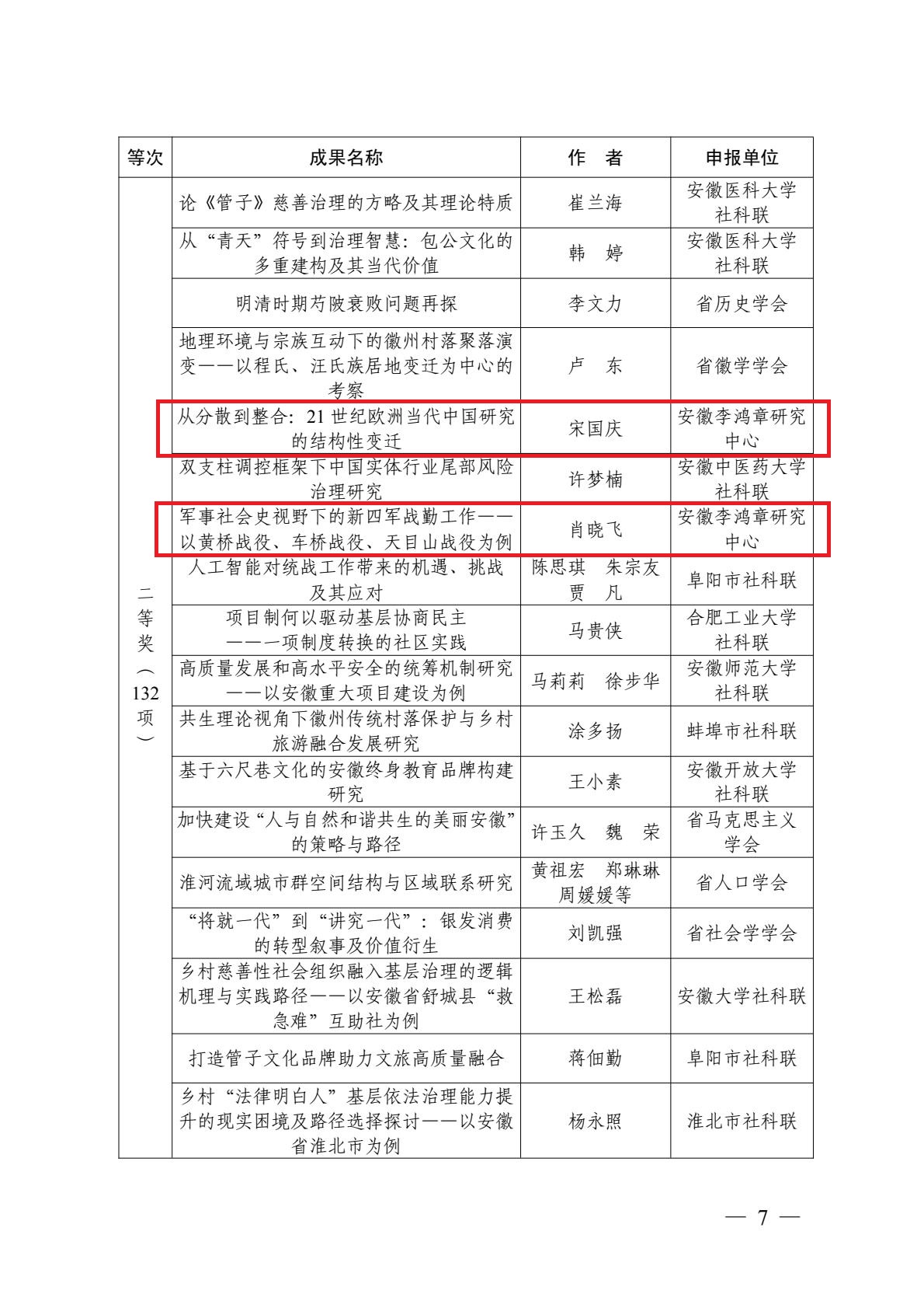 在此次评选活动中,李鸿章中心组织报送的两项研究成果荣获二等奖。其中,宋国庆老师撰写的《从分散到整合:21世纪欧洲当代中国研究的结构性变迁》一文,系统梳理并深入分析欧洲当代中国研究在新时代的演进路径,具有重要的学术参考价值;肖晓飞老师提交的《军事社会史视野下的新四军战勤工作——以黄桥战役、车桥战役、天目山战役为例》,聚焦后勤保障这一维度,为深化新四军研究提供了新的视角与案例。