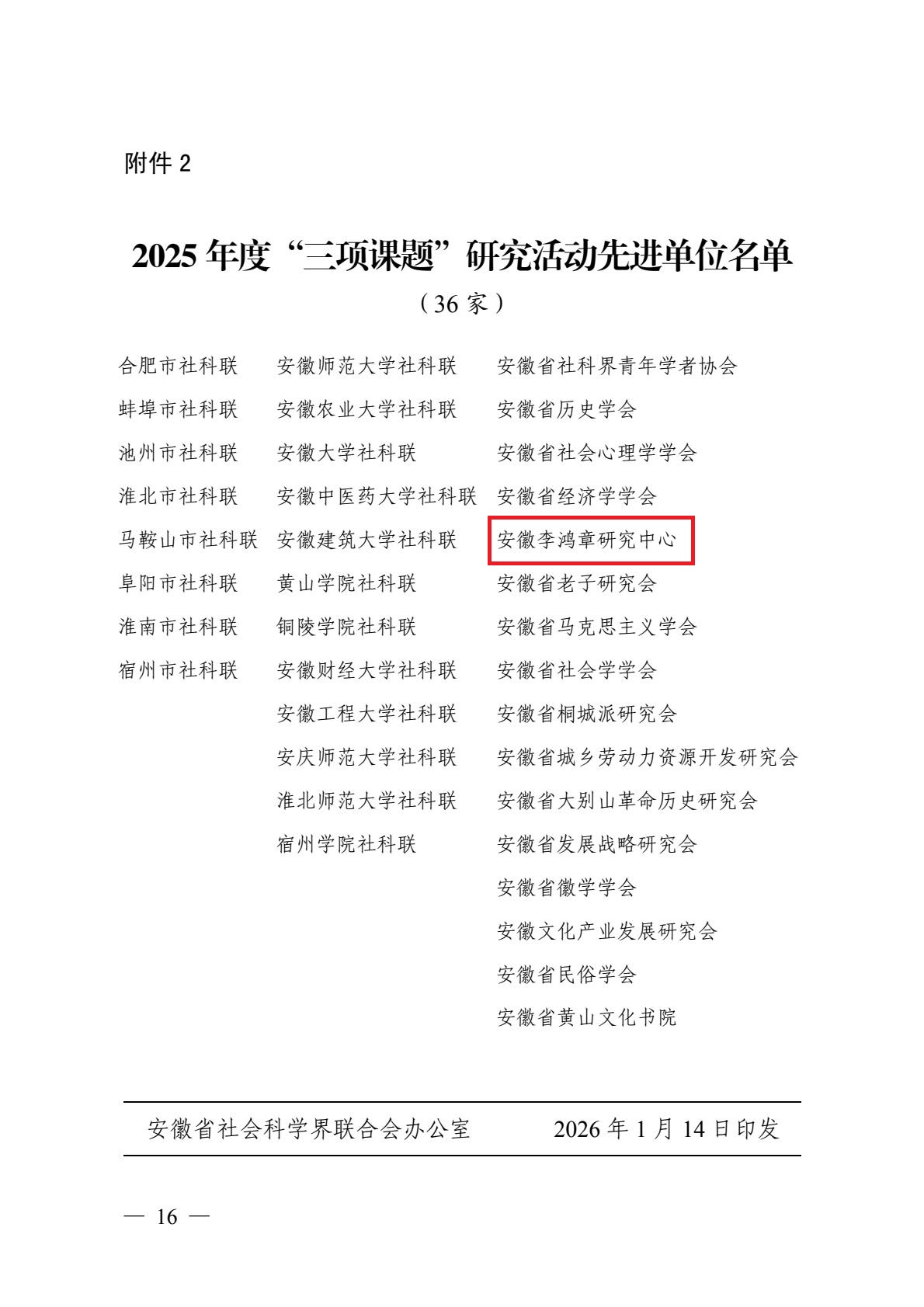近日,安徽省社科联2025年度省“三项课题”研究活动优秀成果与先进单位名单正式公布。李鸿章研究中心凭借出色的科研组织工作与高质量的成果申报,荣获“先进单位”称号。